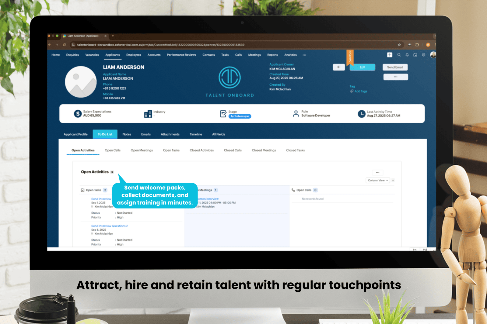 - Onboarding Automation – Send welcome packs, collect documents, and assign training in minutes.